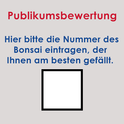 Jeder unserer Besucher bekommt zusammen mit seiner Eintrittskarte einen Stimmzettel für die Publikumsbewertung, auf dem er die Nummer des Bonsai eintragen kann, der ihm am besten gefällt und wirft ihn dann in eine bereitstehende Lostrommel.
